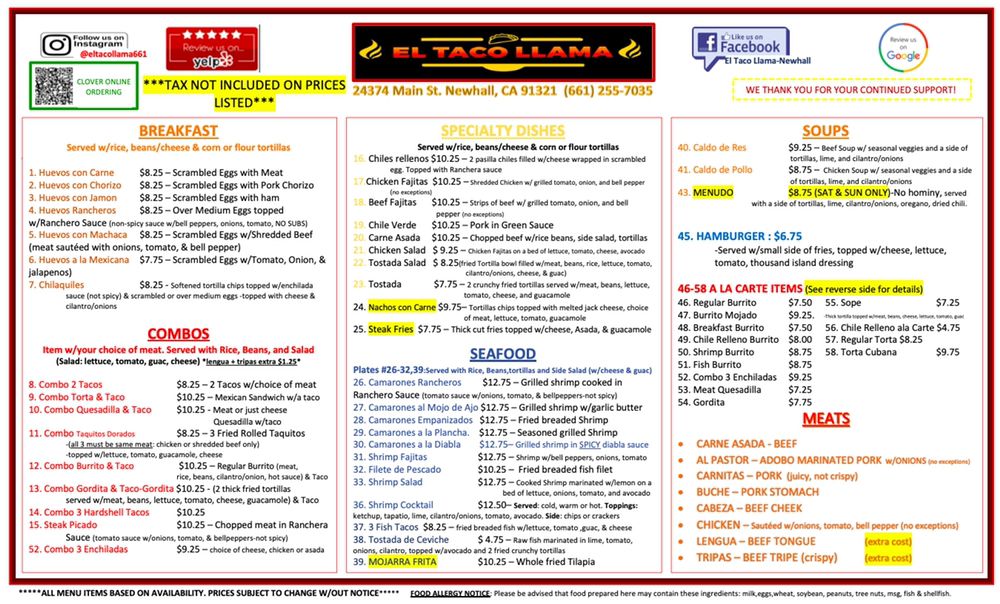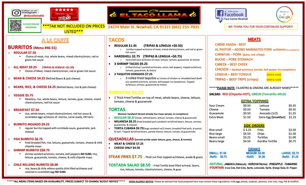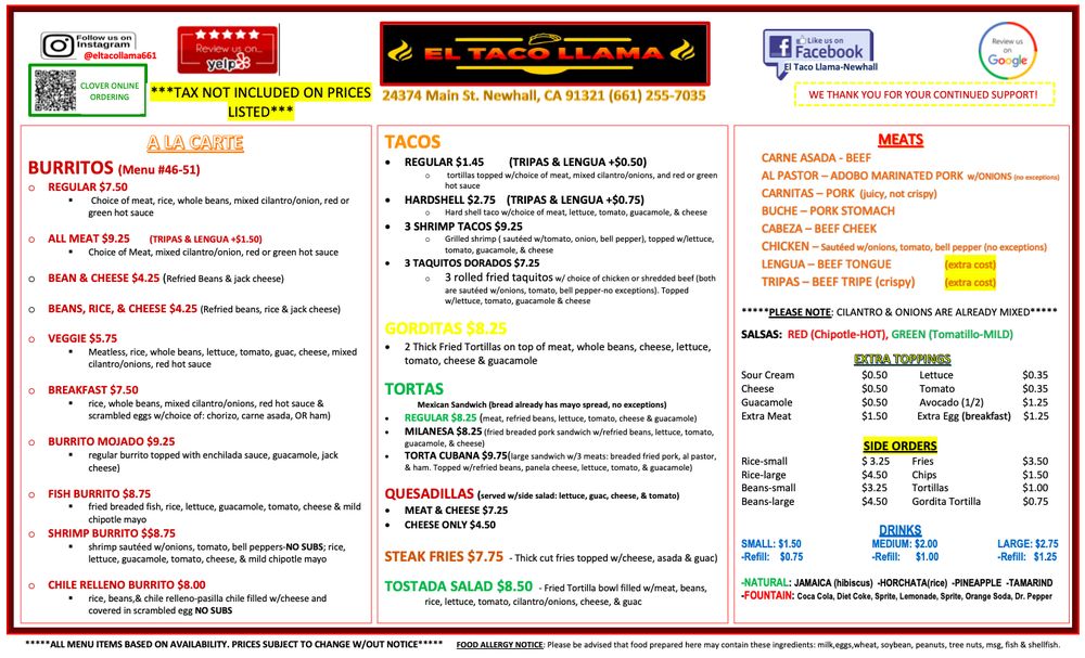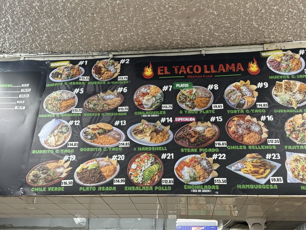 El Taco Llama Menu (Update 2025)